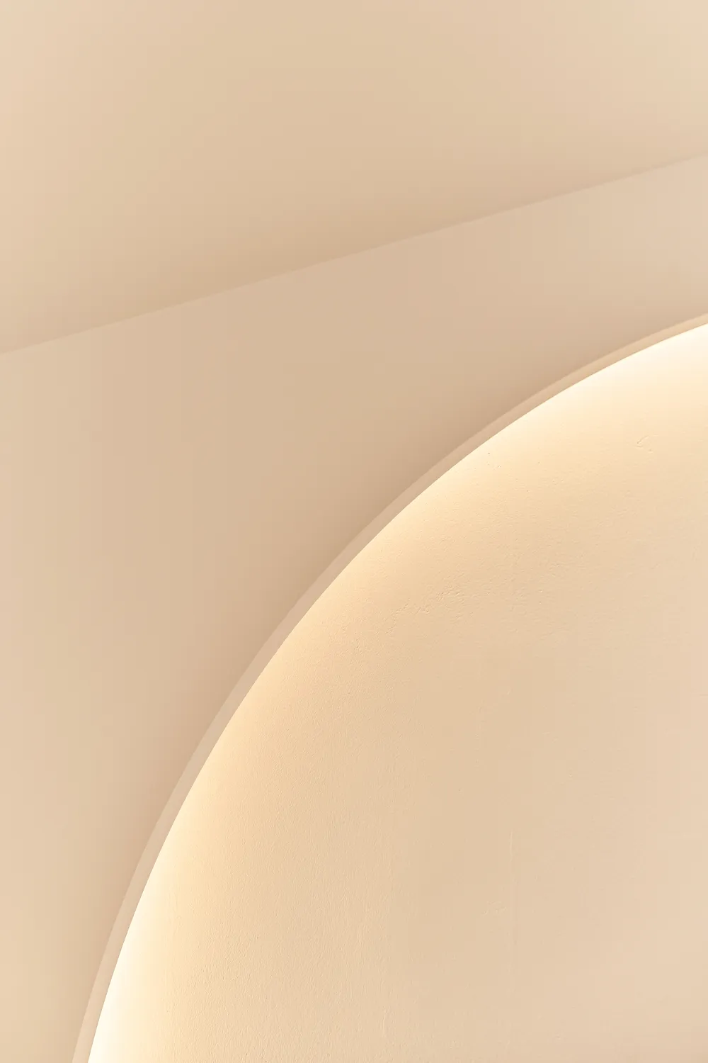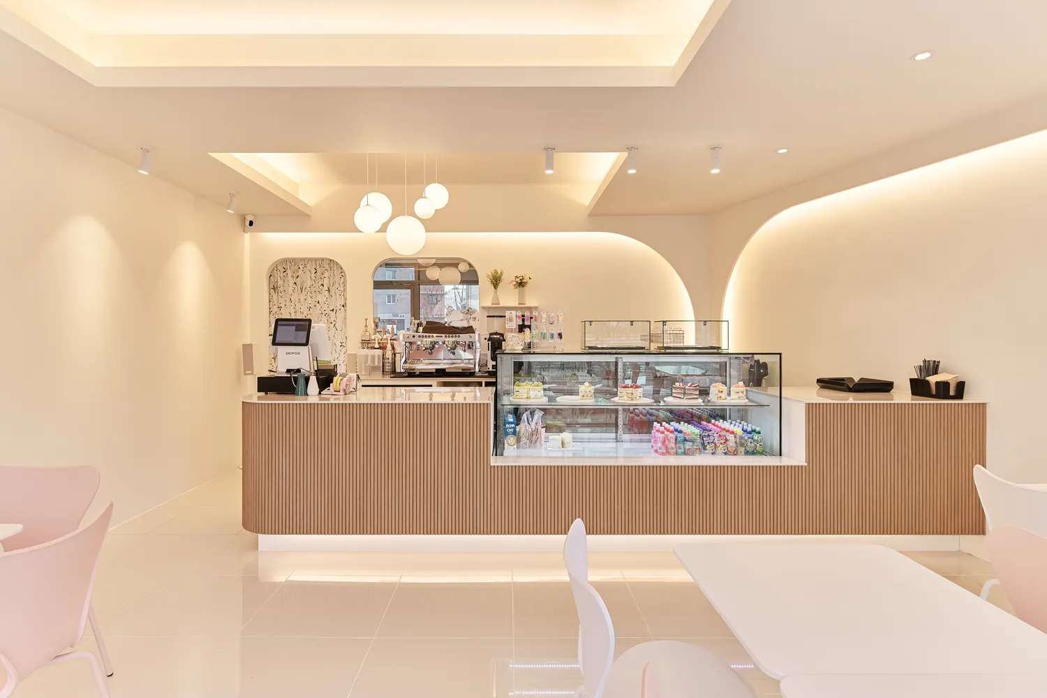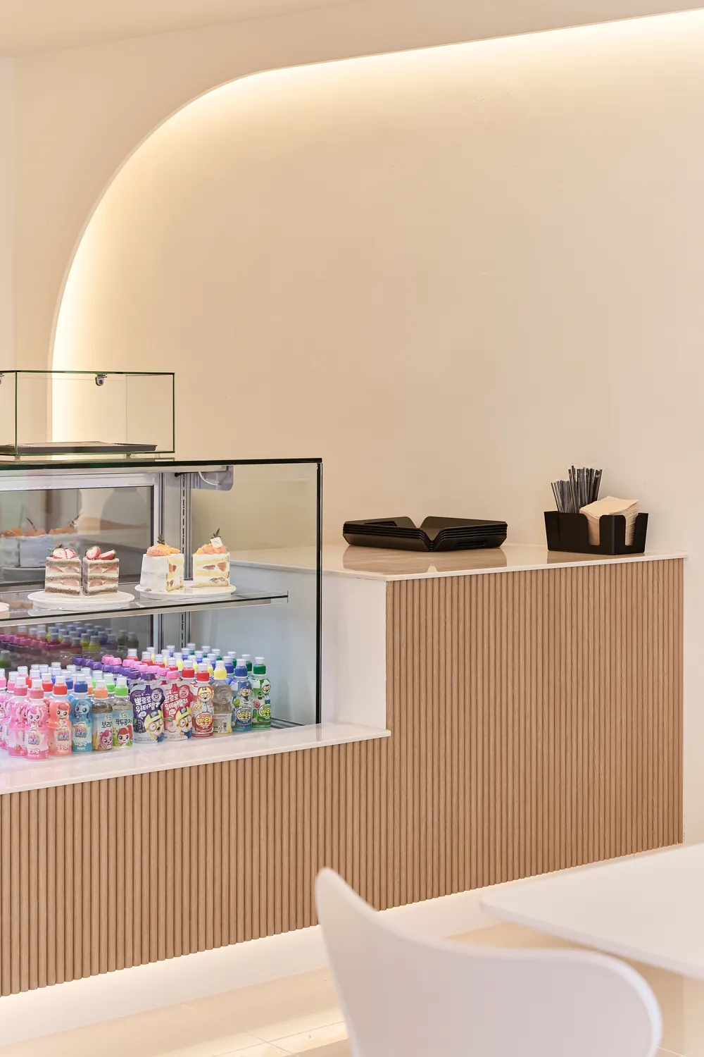 파사드가 통유리로 시공된만큼 내부 조명도 외부에서 최대한 이쁘게 보일 수 있도록 간접등을 많이 사용하고 카운터위치에는 볼조명을 불규칙하게 배치하여 분위기를 내어 드렸습니다. 외부 파사드라운드와같이 안쪽 벽에서 라운드를 만들고 안쪽으로 간접조명 설치하여 외부와 내부에 일체감 있는 디자인에서 신경을 쓴 현장입니다.