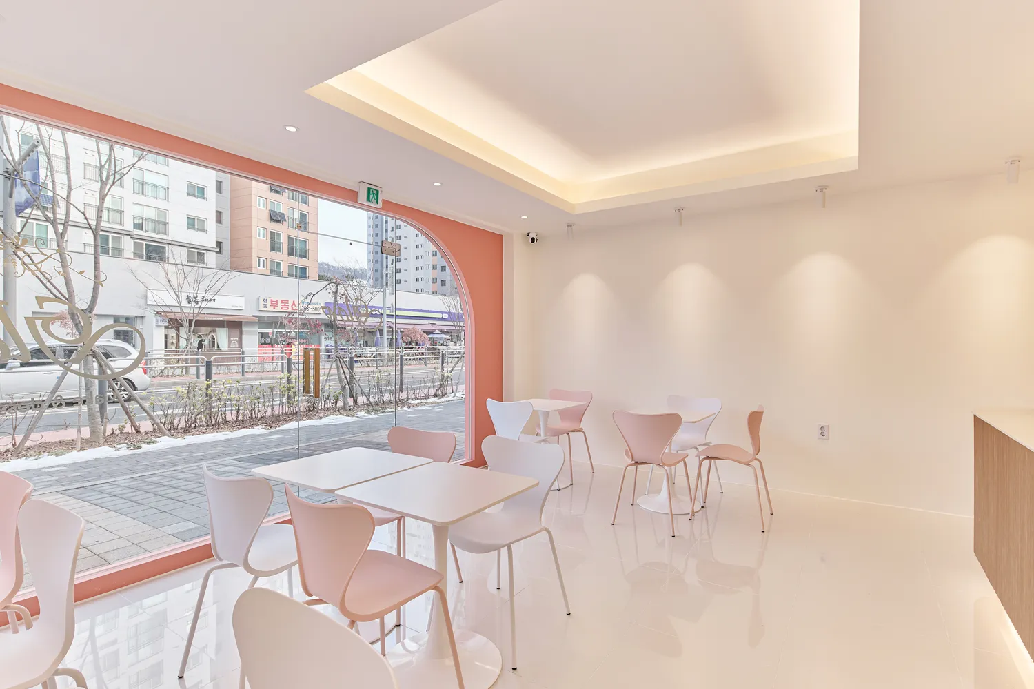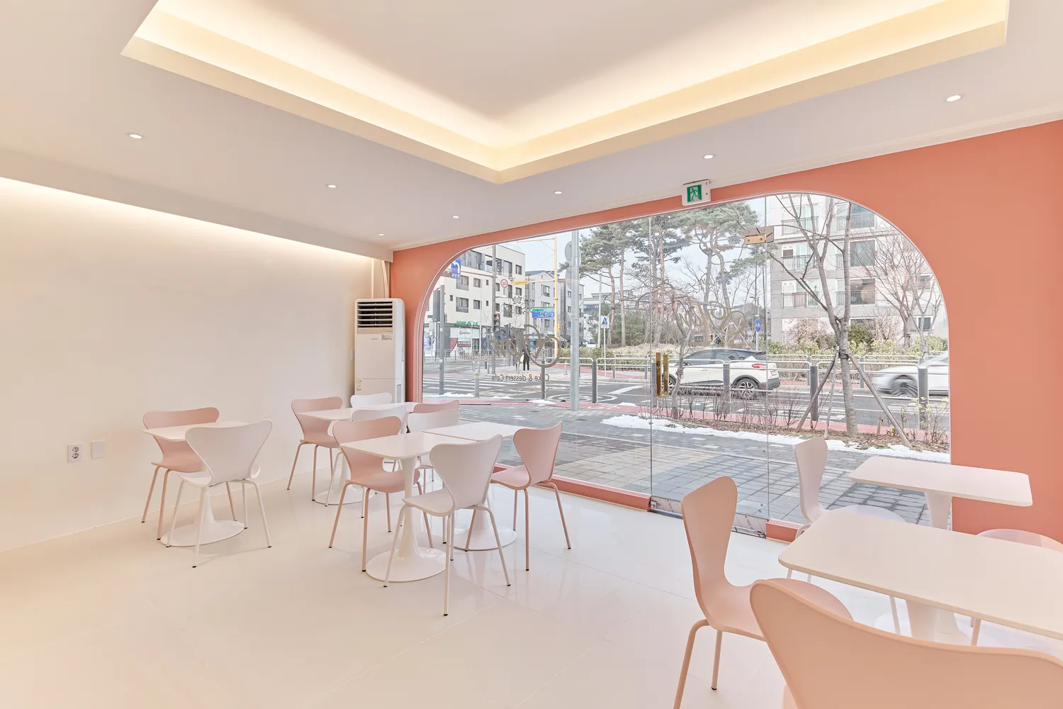 외부 라운드통유리 파사드와 내부 간접조명 인테리어로 외부에서 눈에 확띄는 인테리어입니다. 내부, 외부 모두 시선을 사로잡을 만한 컨셉으로 접근하여 간판 글자까지 골드스텐으로 디자인 하였습니다.