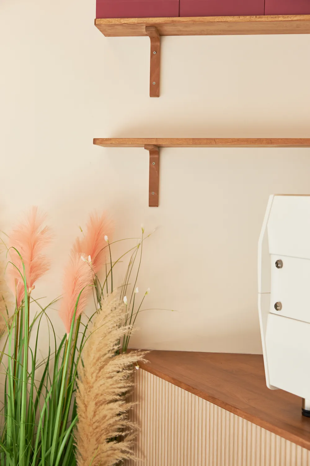 템바보드를 사용한 커피바,상판은 우드를 사용하고 스테인 작업 후 코팅 마우리하였습니다. 바닥은 테라조 타일로 조화조경과 어울리게 마감해 드렸습니다.