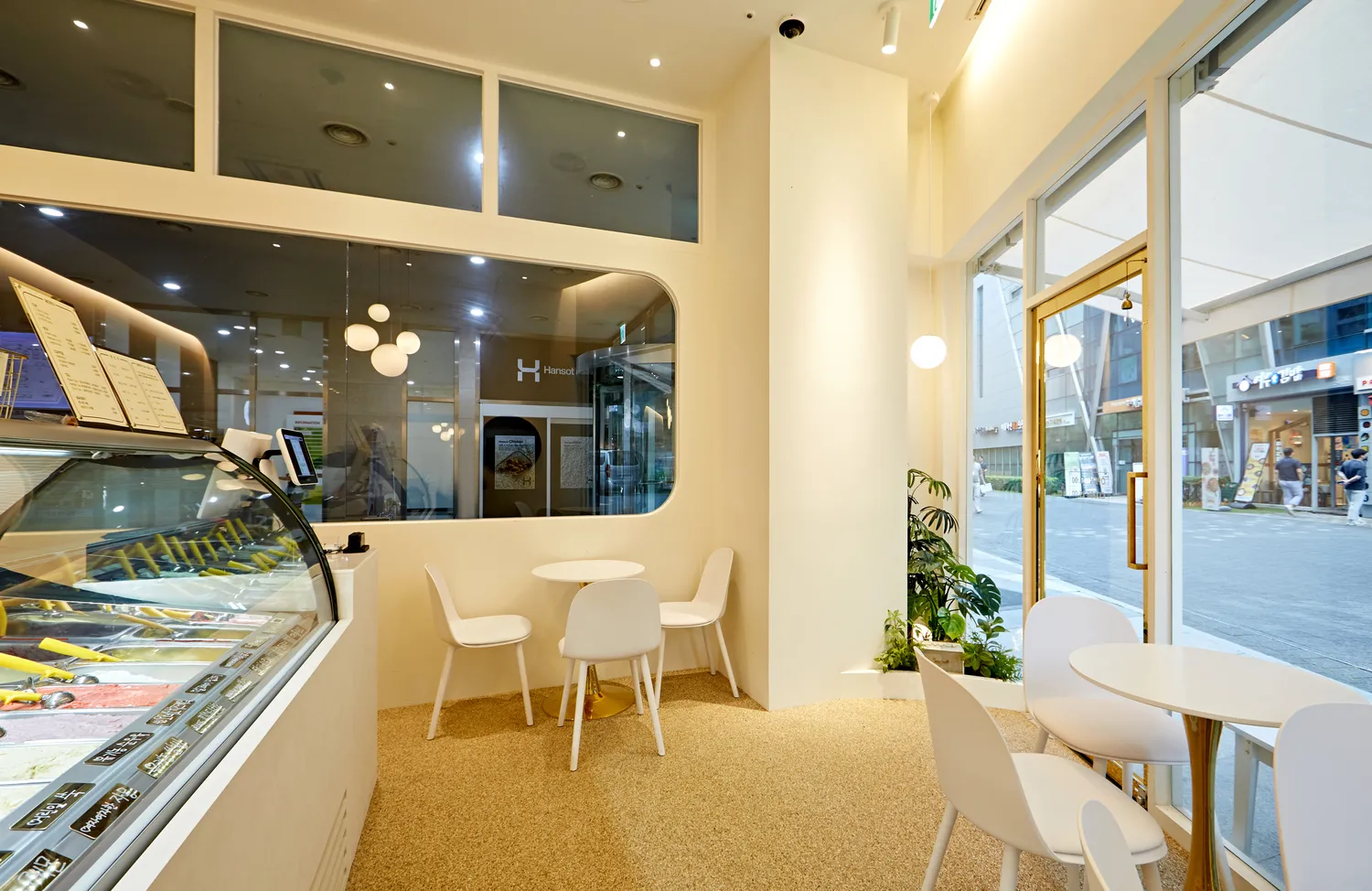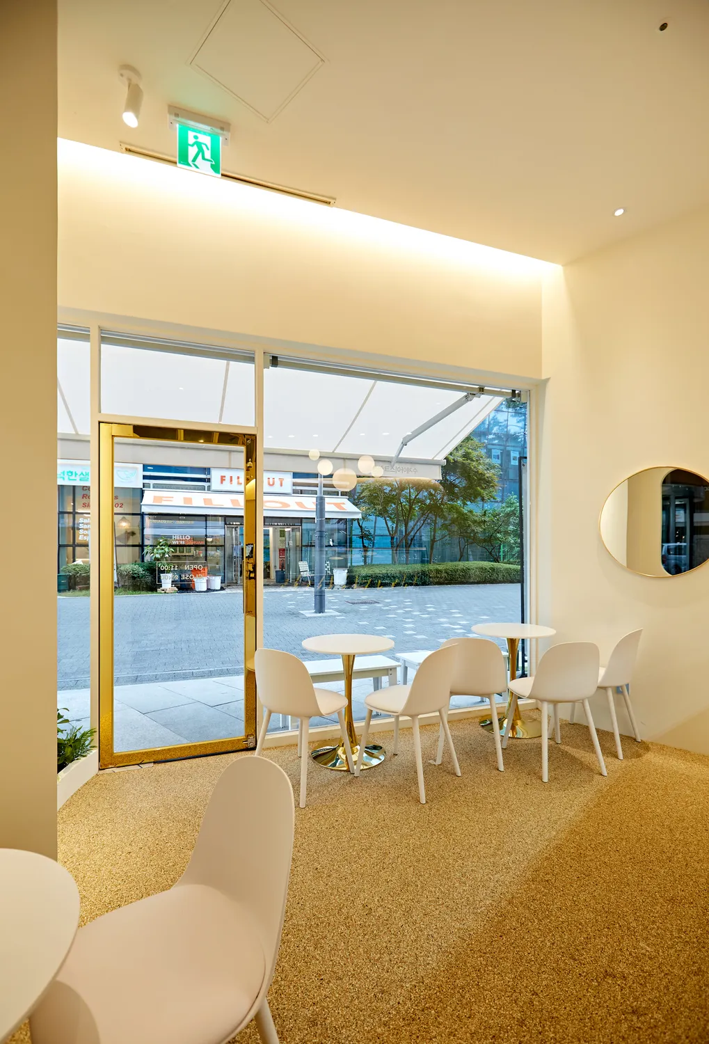 오른쪽 복도를 지나가는 사람들에게 매장이 눈에 띄이도록 라운드 통창으로 벽을 만들어드리고 마감했습니다.