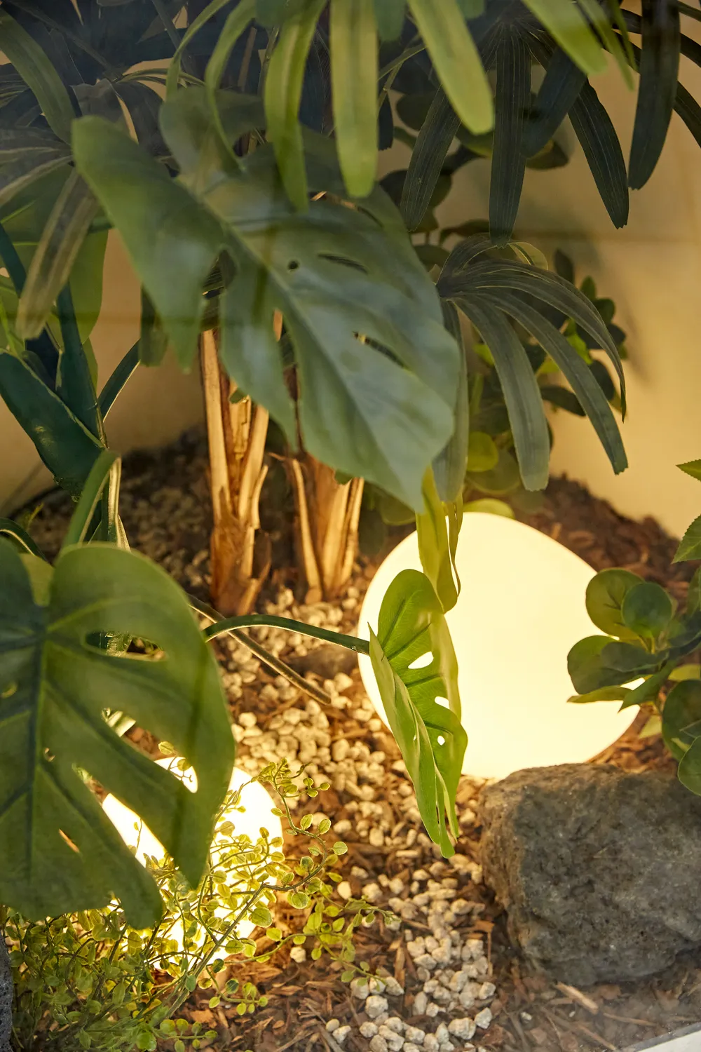 출입문 오른쪽 애매한 자투리 공간이 있어 조경으로 활용했습니다. 조경 안쪽에는 돌모양의 조명과 소품등으로 고급스런고 생화느낌이 나는 조화조경이 완성되었습니다.