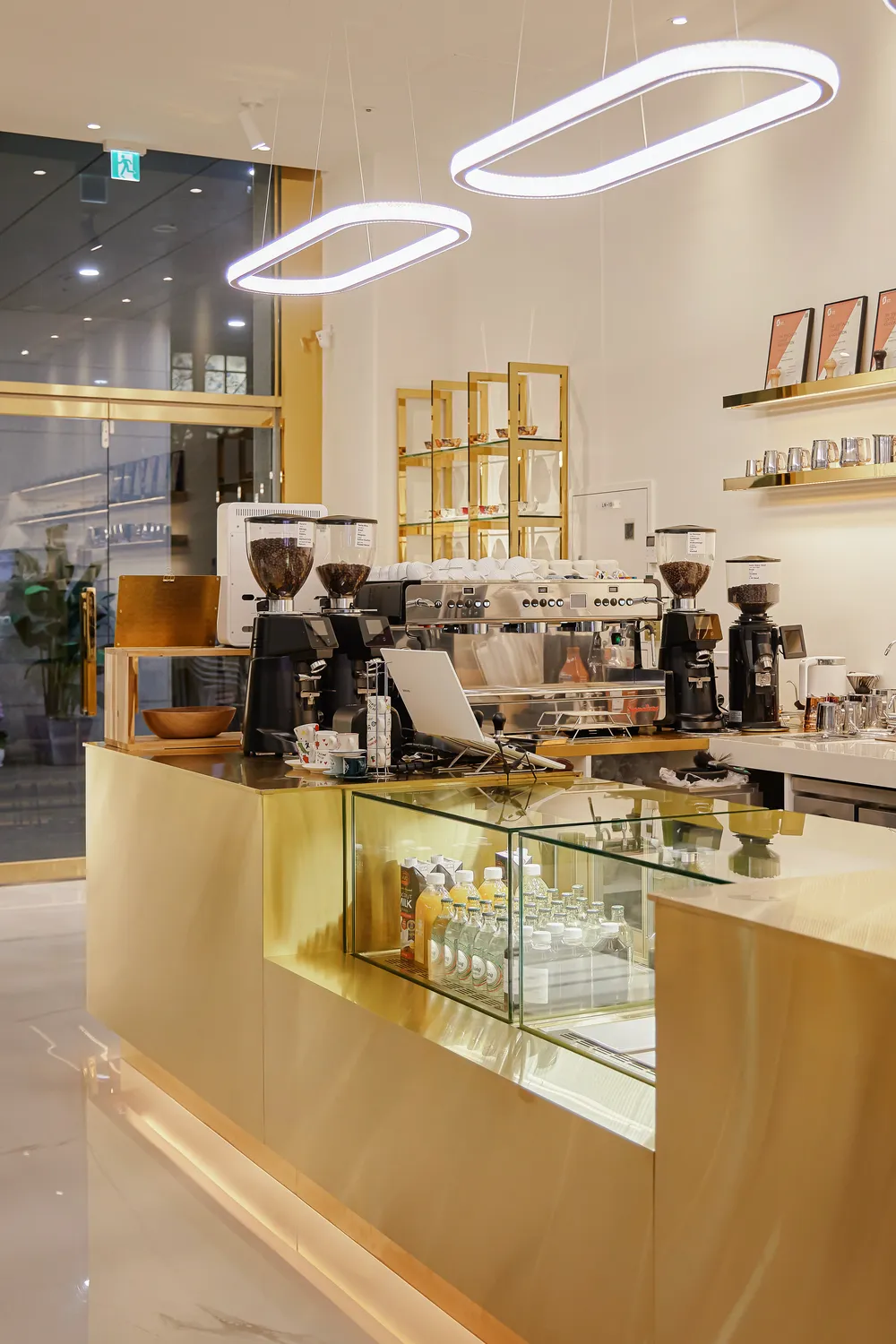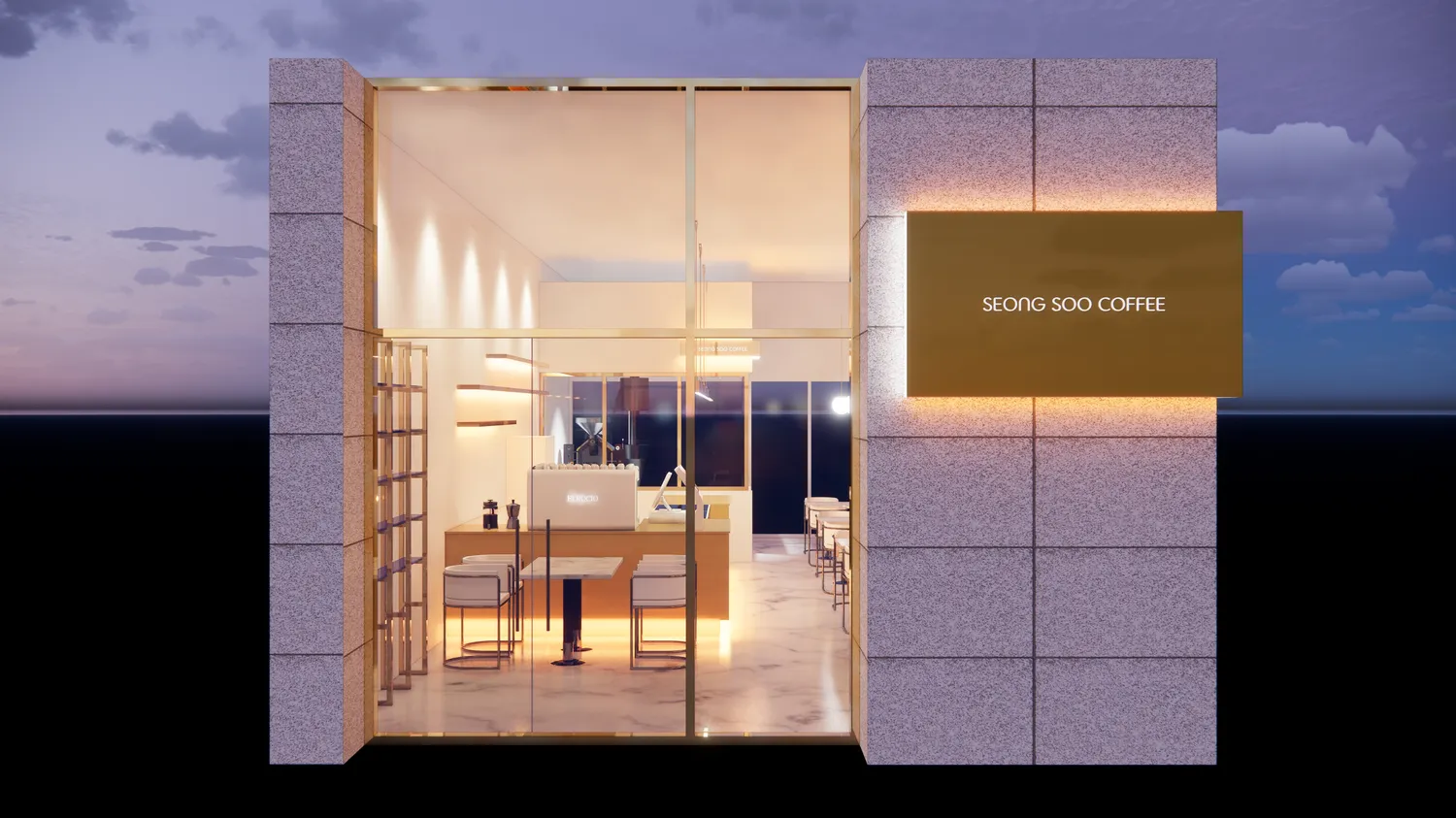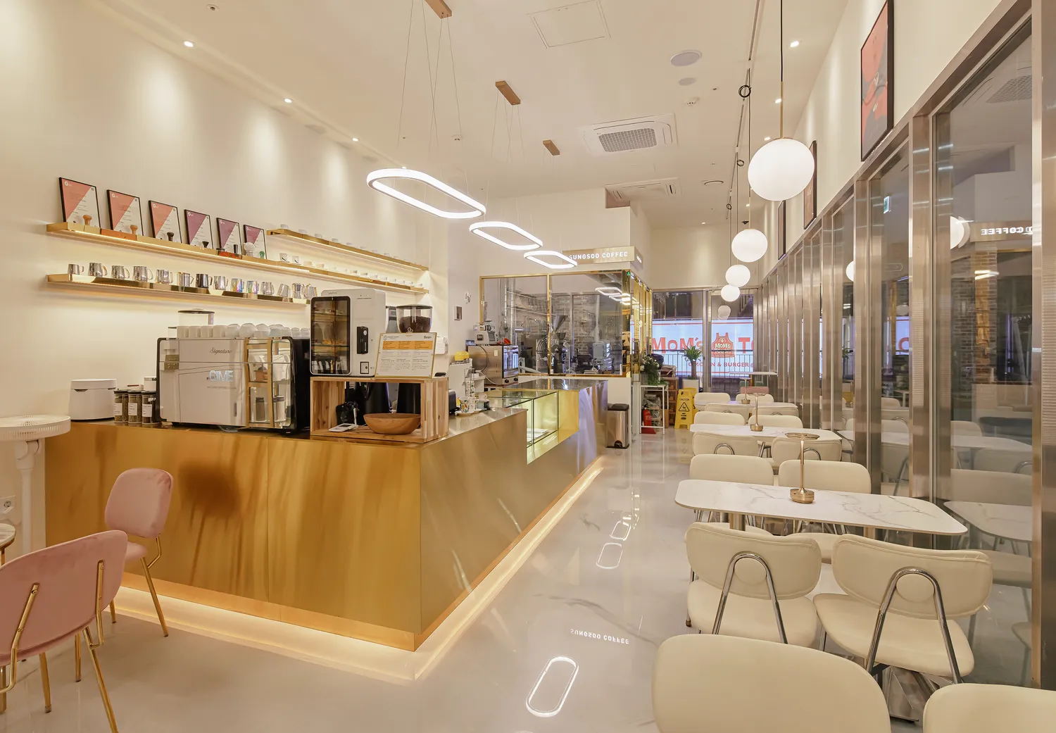 컨셉을 골드스텐으로 잡았는데 입구 창틀과 문이 은색 스텐으로 되어있어 모두 철거하고 골드스텐 틀로 모두 교체했습니다. ㅁ간판 컨셉까지 골드스텐이라 이번현장은 간판까지 같이 진행해드렸습니다. 간판은 글자와 로고를 레이저타공해서 골드스텐 판 안에서 빛이나오는 디자인으로 시공해드렸습니다. 내부 스카시와 로스팅실 실내간판도 같은 컨셉으로 통일감있게 진행했습니다.