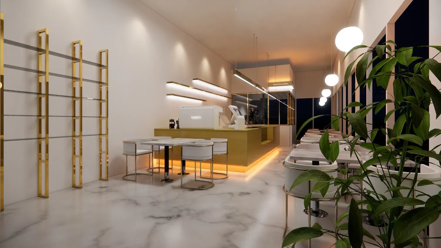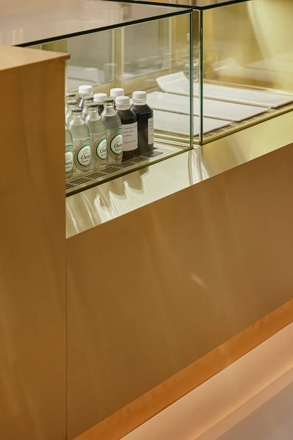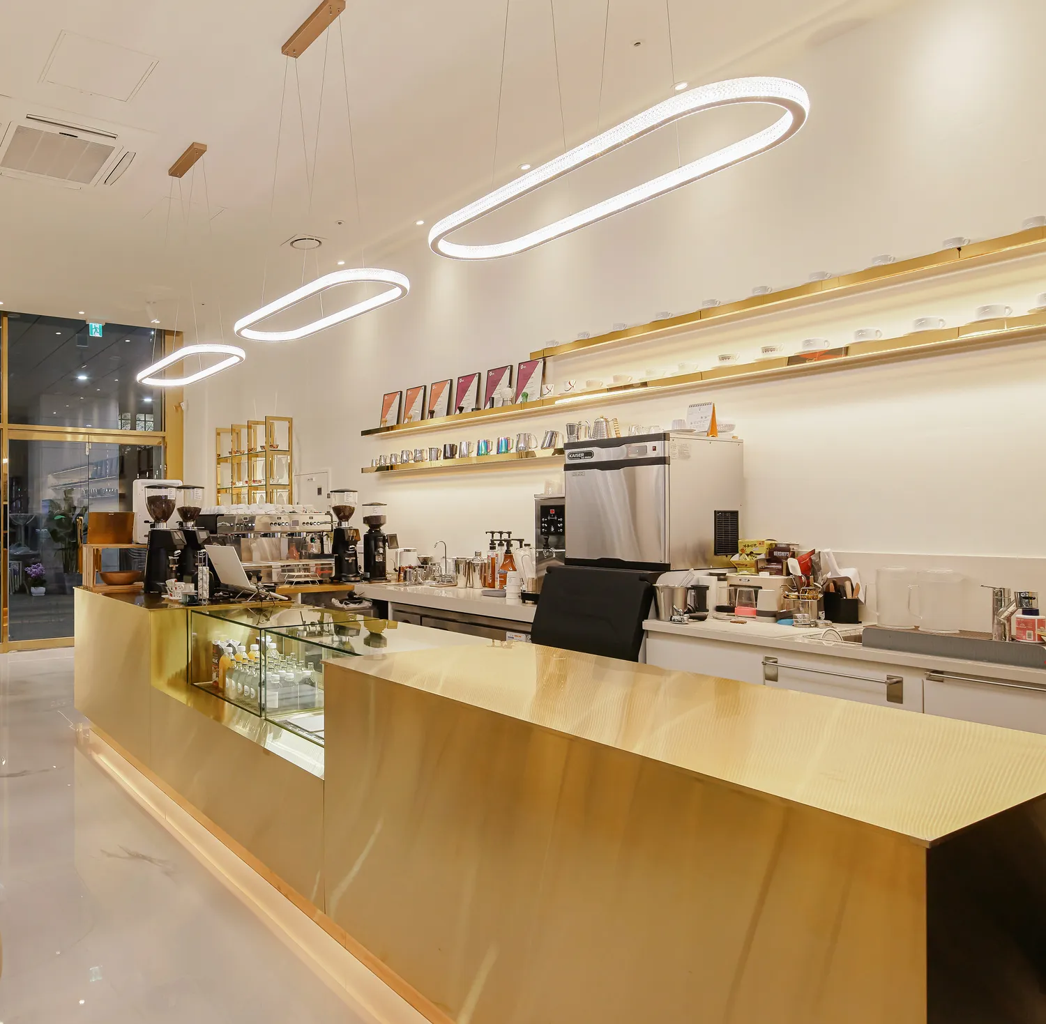 이전 운영하신 매장에서 스텐 카운터를 사용하셨고 이번현장에는 골드스텐을 메인 컨셉으로 한 디자인을 원하셨습니다. 장식장이나 선반까지 모두 골드스텐으로 디자인하였고 바닥은 마블에폭시로 마감해드렸습니다.