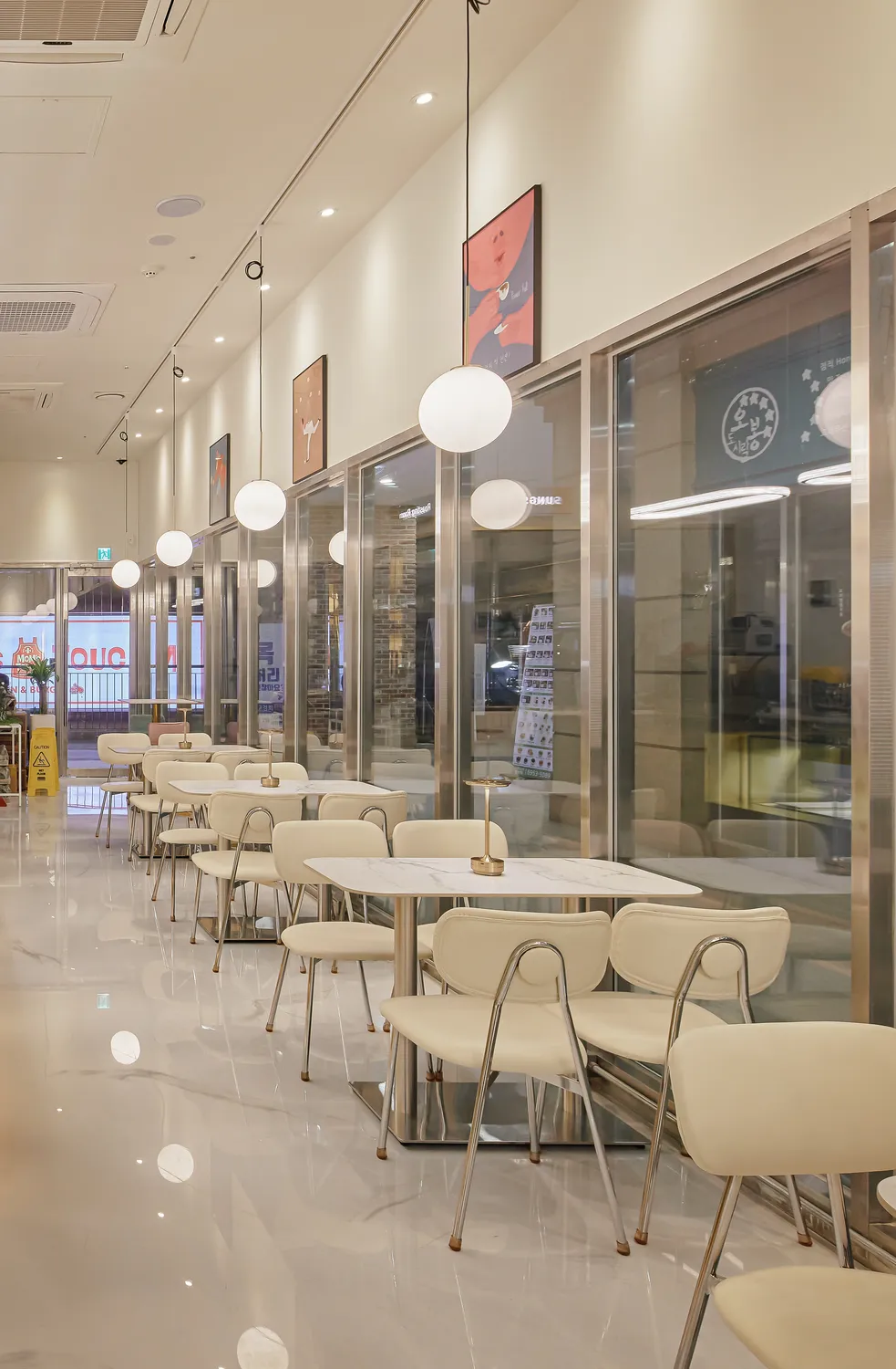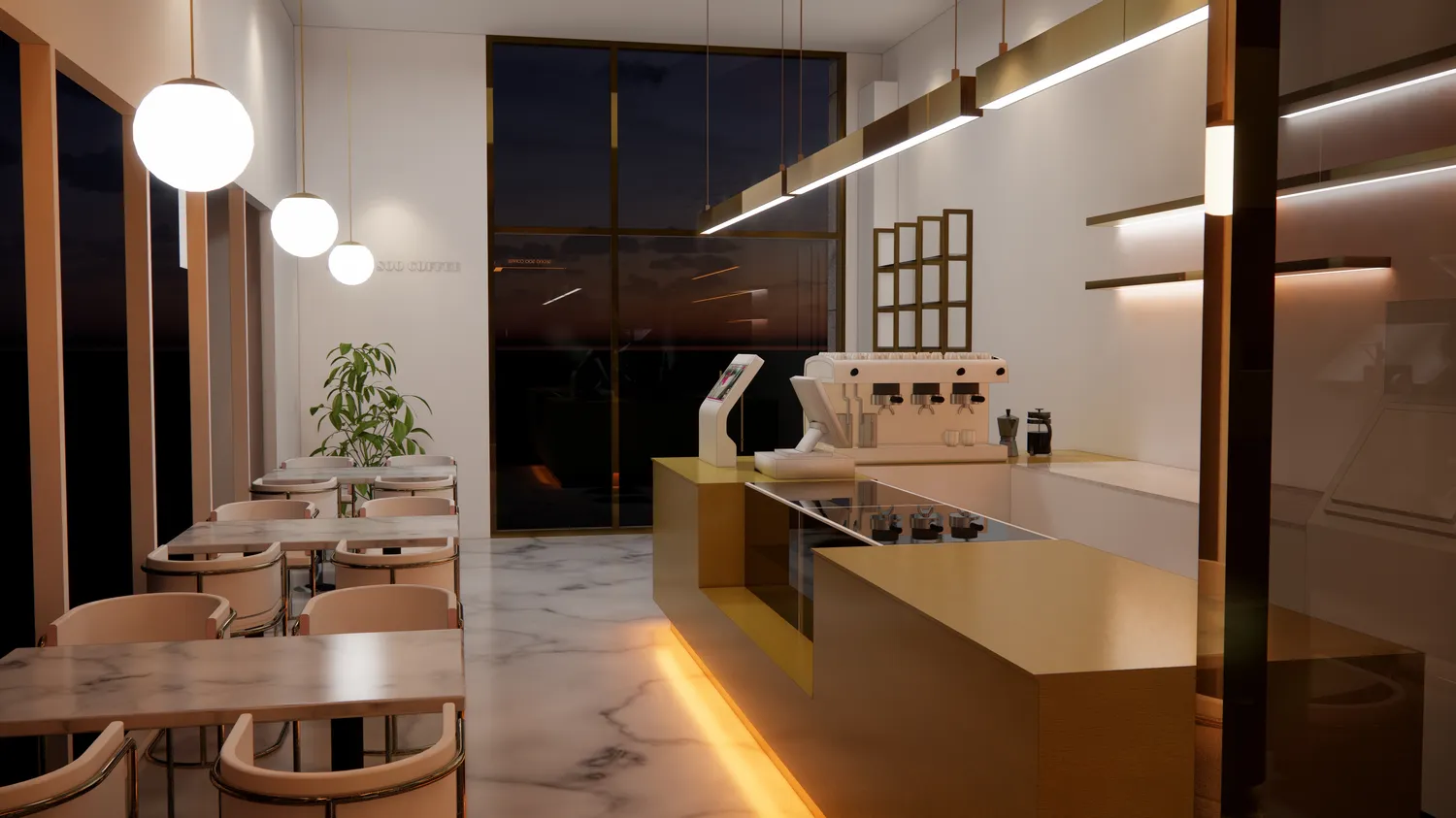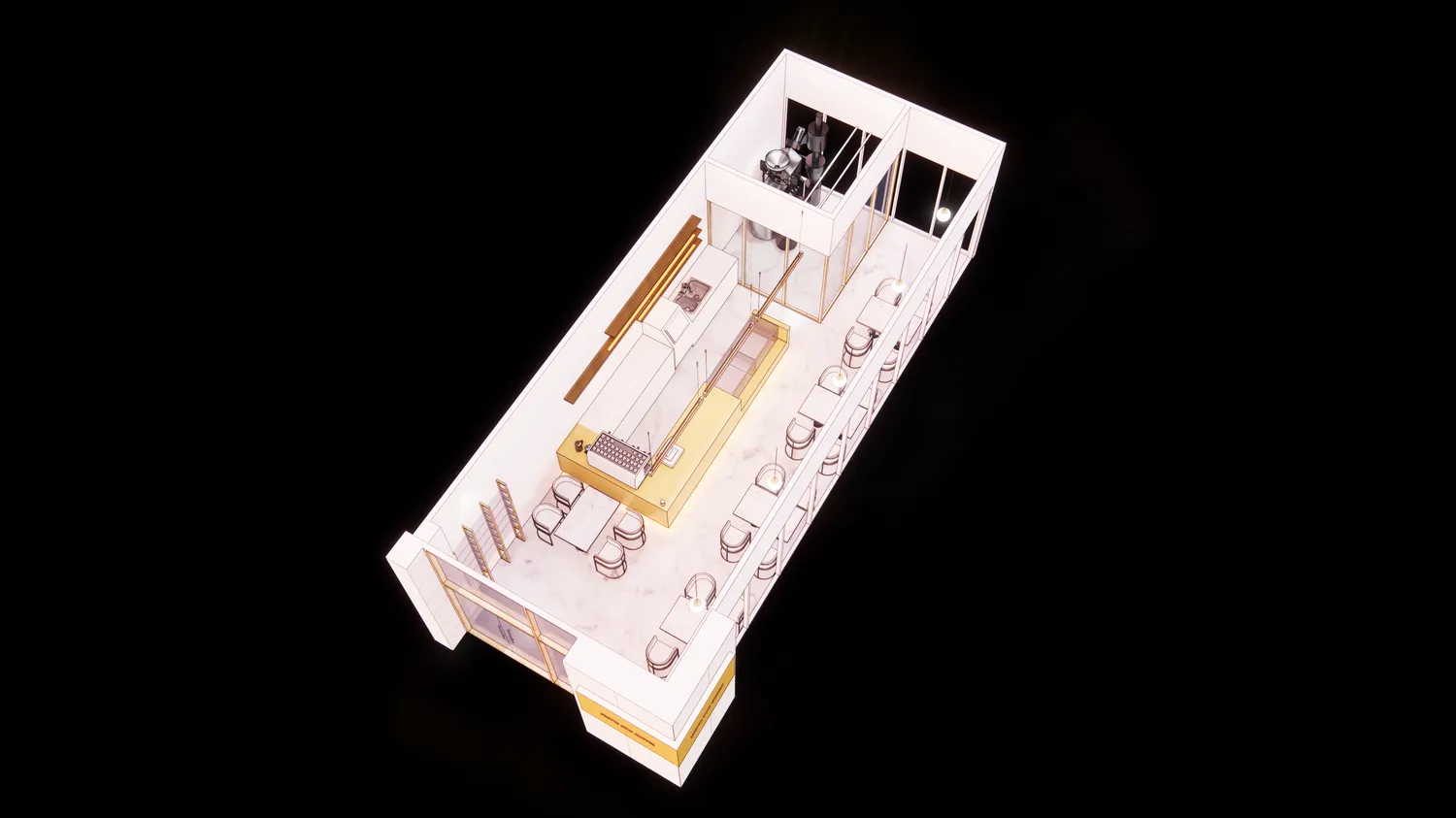 이전 운영하신 매장에서 스텐 카운터를 사용하셨고 이번현장에는 골드스텐을 메인 컨셉으로 한 디자인을 원하셨습니다. 장식장이나 선반까지 모두 골드스텐으로 디자인하였고 바닥은 마블에폭시로 마감해드렸습니다.