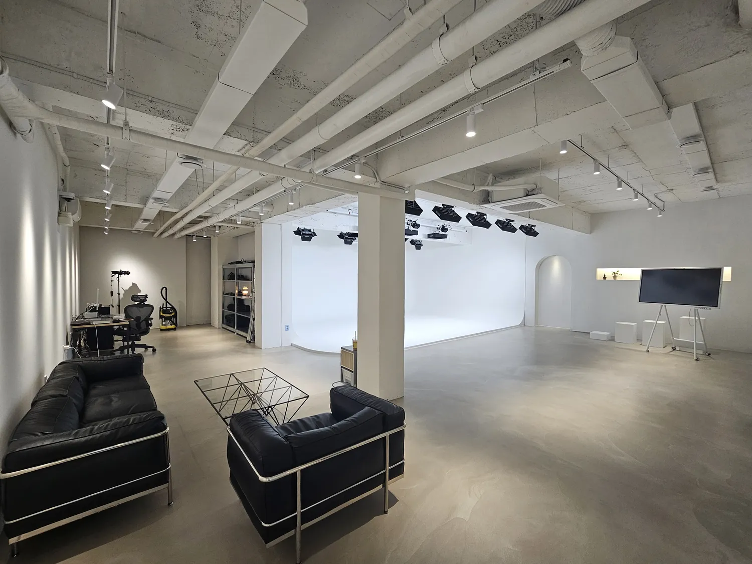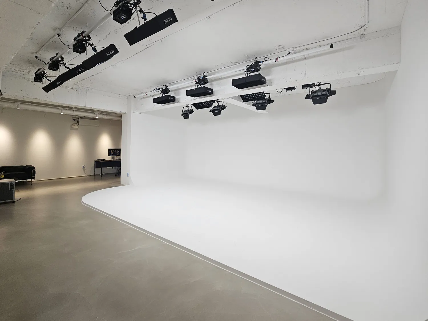 3면을 모두 라운드로 만든 3면 호리존으로 제작하였습니다. 동영상 촬영도 많이 하기에 최대한 호리존을 넓게 쓸 수 있도록 제작하였습니다.
