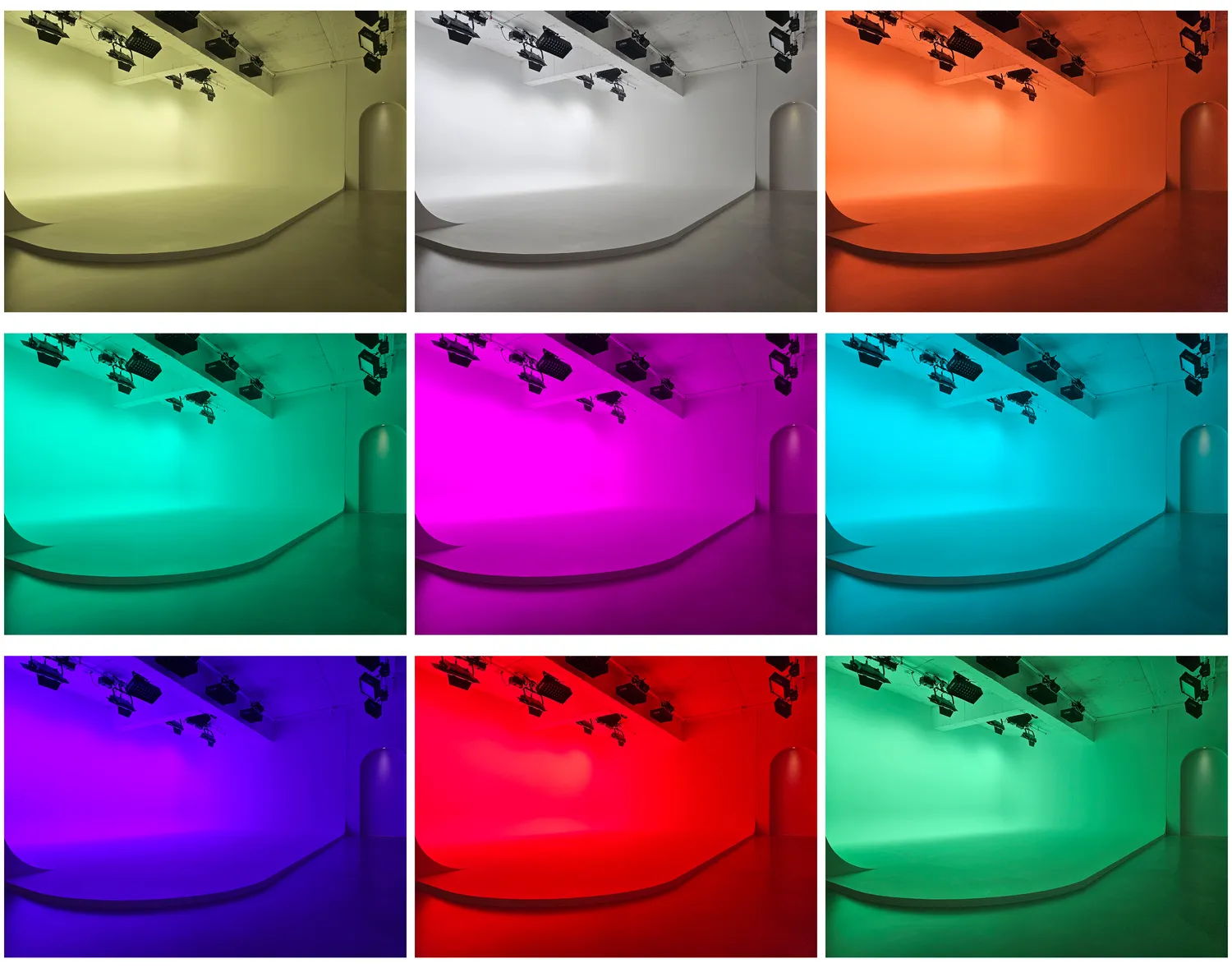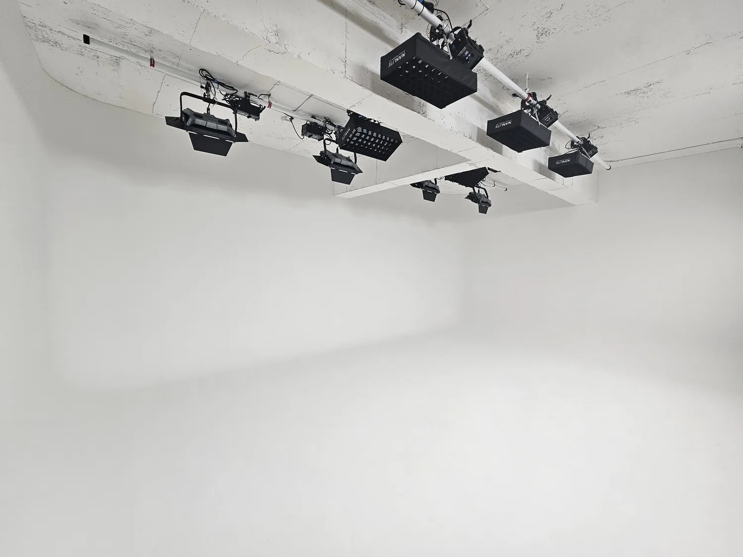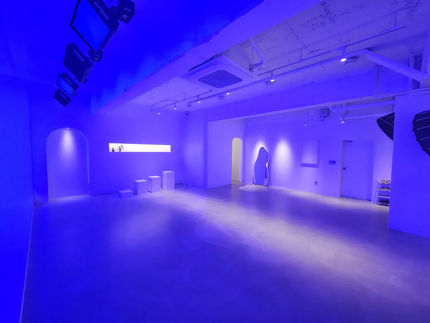 호리존 안쪽과 천장쪽으로 조명을 설치해 배경지 필요없이 여러가지 컨셉의 촬영이 가능합니다. 조명은 고객님께서 직접 구매하셔서 전기 설비를 도와드렸습니다.